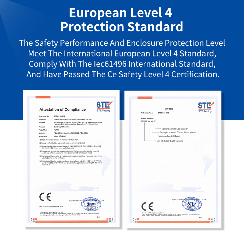 ประสิทธิภาพด้านความปลอดภัยและระดับการป้องกันเปลือกหอยถึงมาตรฐานสากลของยุโรปสี่มาตรฐานตามมาตรฐานสากล IEC61496 ผ่านการรับรองความปลอดภัย CE ระดับ 4