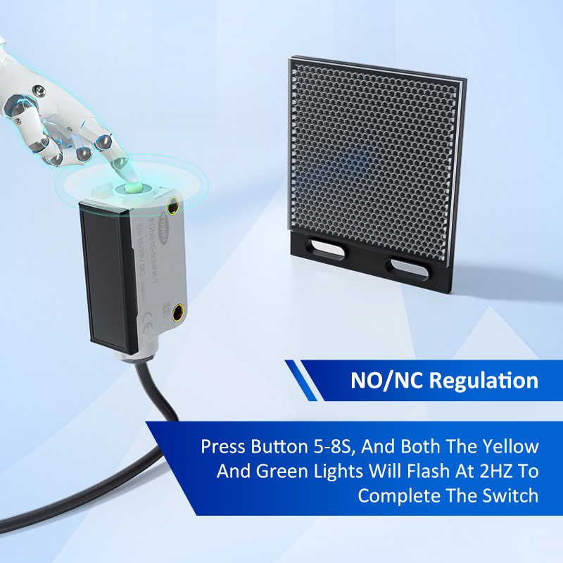 อุปกรณ์ติดตั้งฟังก์ชั่นการปรับที่ชาญฉลาดสูง การตั้งค่าระยะทางนั้นใช้งานง่ายและสะดวกสบาย: จัดแนวกับแผ่นสะท้อนแสงกดปุ่มเป็นเวลา 2-5 วินาทีและแสงสีเหลืองเขียวกระพริบที่ 4Hz หมายถึงการตั้งค่าที่ประสบความสำเร็จ หากไฟคู่เปลี่ยนเป็น 8Hz แบบอะซิงโครนัสมันจะบ่งบอกถึงความล้มเหลวและสลับเป็นระยะการตรวจจับสูงสุดโดยอัตโนมัติ การสลับระหว่างโหมดเปิดตามปกติ (NO) และโหมดปิดปกติ (NC) มีประสิทธิภาพเท่ากัน-กดปุ่มเป็นเวลา 5-8 วินาทีและไฟคู่จะกะพริบในการซิงค์ที่ 2Hz เพื่อยืนยันว่าสวิตช์โหมดเสร็จสมบูรณ์ สวิตช์โฟโตอิเล็กทริกที่เข้ากันได้กับหลาย ๆ ฉากนี้ทำให้การปรับพารามิเตอร์ที่ใช้งานง่ายกว่าที่เคย