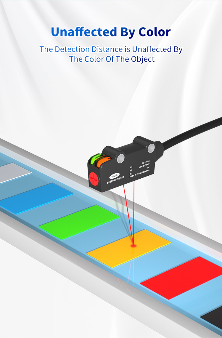 เซ็นเซอร์โฟโตอิเล็กทริกแบบดั้งเดิมมักจะต้องมีพารามิเตอร์การตรวจจับการปรับใหม่อีกครั้งเมื่อพบวัตถุที่มีสีต่างกันส่งผลกระทบอย่างรุนแรงต่อประสิทธิภาพการผลิต FGNS08-10 ซีรี่ส์ใช้เทคโนโลยีการปราบปรามพื้นหลังขั้นสูงเพื่อให้มั่นใจว่าระยะการตรวจจับยังคงไม่ได้รับผลกระทบอย่างสมบูรณ์จากสีของวัตถุ ด้วยช่วงการตรวจจับที่ปรับได้สูงสุด 10 ซม. เซ็นเซอร์จะรักษาประสิทธิภาพที่สอดคล้องกันโดยไม่คำนึงถึงวัตถุมืดแสงหรือสี สิ่งนี้ช่วยเพิ่มความสามารถในการปรับตัวและความมั่นคงของสายการผลิตอย่างมีนัยสำคัญ