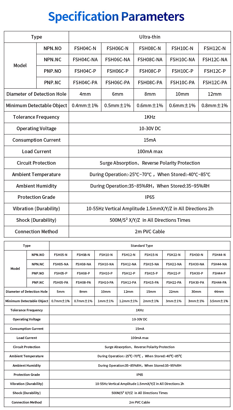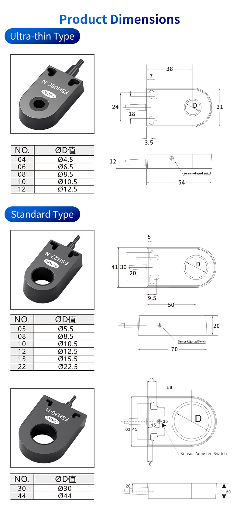 เซ็นเซอร์สำหรับทุกการใช้งานเราเข้าใจดีว่าการตั้งค่าระบบอัตโนมัติสองแบบไม่เหมือนกัน นั่นเป็นเหตุผลที่ซีรีส์ FSH05-FSH44 มีจำหน่ายในสองฟอร์มแฟคเตอร์ที่แตกต่างกันและขนาดรูรับแสงหลายขนาด ชนิดบางพิเศษ: เหมาะสำหรับสภาพแวดล้อมที่มีพื้นที่จำกัด ซึ่งพื้นที่การติดตั้งมีจำกัด รูปทรงเพรียวบางทำให้สามารถติดตั้งในเครื่องจักรที่คับแคบได้โดยไม่กระทบต่อประสิทธิภาพการตรวจจับ ประเภทมาตรฐาน: นำเสนอประสิทธิภาพที่แข็งแกร่งสำหรับการใช้งานทั่วไป โดยให้โซลูชันการตรวจจับที่แข็งแกร่งและเชื่อถือได้
